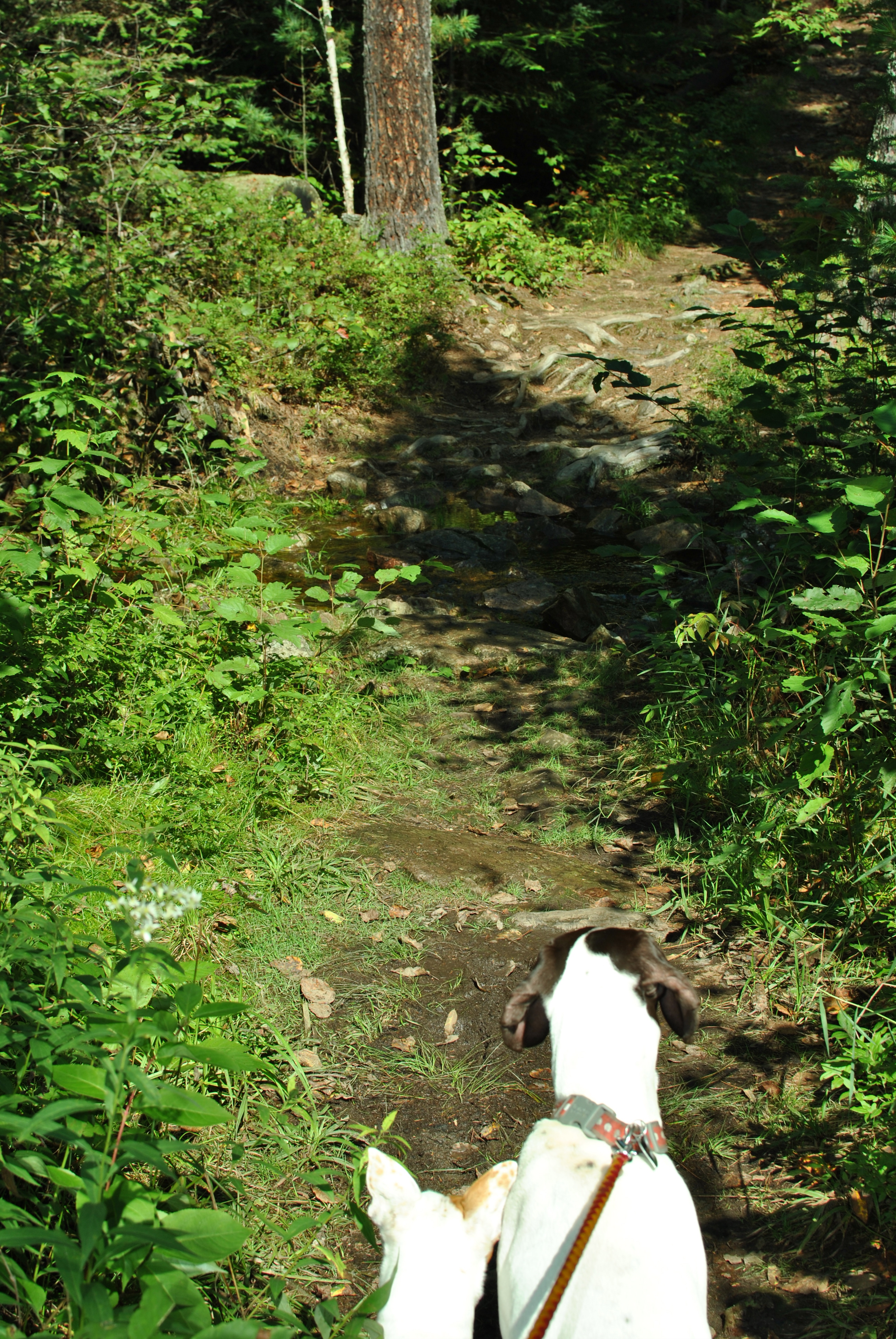 While hiking I thought it seemed rather difficult from what I read over at bwca.com – and wondered if I was on the wrong path. After 30 minutes of hiking with no compass, and more difficulty bushwhacking and questioning if I was going the right way after many twists and turns – I decided I best turn around before I became lost in the forest. Luckily I had packed plenty of water for my dogs and I.